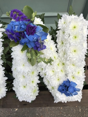 This tribute is crafted using white chrysanthemums, finished with clusters of white roses. Clusters can be customised to your choice of colour. The edging is made with foliage and is £50 per letter.letter