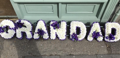 This tribute is crafted using white chrysanthemums, finished with clusters of  purple flowers. Clusters can be customised to your choice of colour. The edging is made with ribbon edge and is £50 per letter.